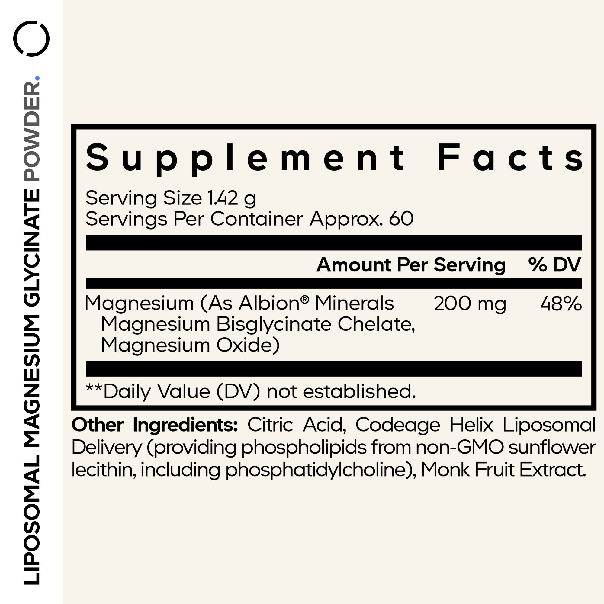 This premium supplement combines the benefits of magnesium glycinate with advanced liposomal delivery for enhanced bioavailability. This powder supplement is carefully crafted with a unique phospholipid complex, ensuring optimal absorption of magnesium. Each bottle contains 60 servings, providing a 2-month supply. With its vegan, gluten-free, and dairy-free formula, it's perfect for those with dietary restrictions.