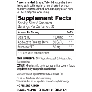 When low acid causes occasional heartburn, the simple solution is to add more. Betaine HCl increases acid levels so your stomach can naturally digest properly. Enzymes are added to support gentle digestion, while MucoSave, a combination of prickly pear and olive leaf extracts, soothes the stomach lining.