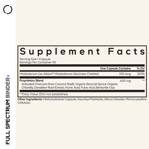 Codeage Full Spectrum Binder+ supplement combines molybdenum, activated charcoal, and bentonite clay, enriched with fulvic and humic acids and organic extracts. This powerful formula features molybdenum as Albion® molybdenum glycinate chelate, activated charcoal, and bentonite clay, designed to complement the body's natural processes and offer a balanced approach to daily supplementation.