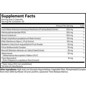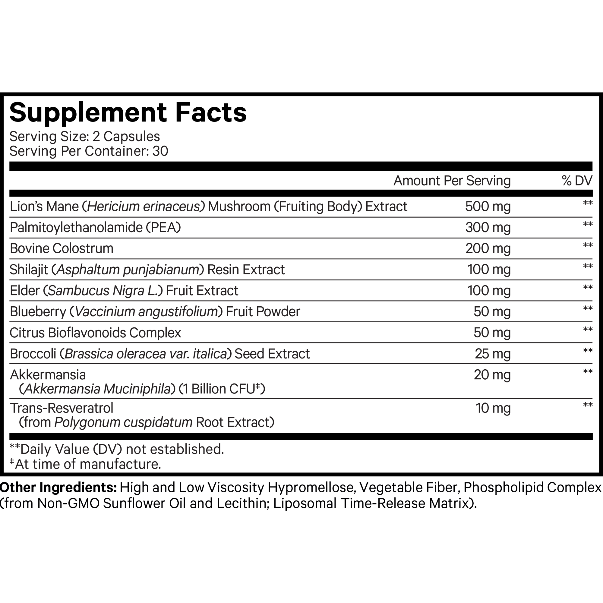 Main Ingredients Lion's Mane, PEA, Colostrum, Shilajit, Elder Fruit, Akkermansia, Resveratrol