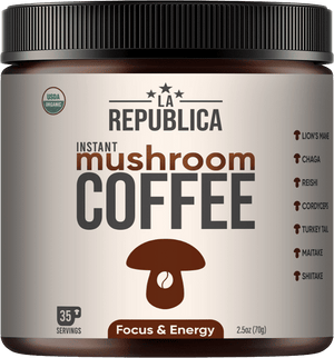 Elevate your daily cup with LA Republica's Instant Mushroom Coffee 70g, a harmonious blend of seven superfood mushrooms.