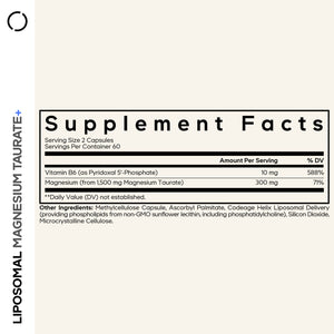 Perfect for those seeking a high-quality magnesium supplement. Supports nutritional needs with magnesium taurate and vitamin B6. Liposomal delivery for enhanced bioavailability. Vegan, non-GMO, and free from common allergens. Manufactured in a cGMP-certified facility in the USA. 2-month supply in each bottle.