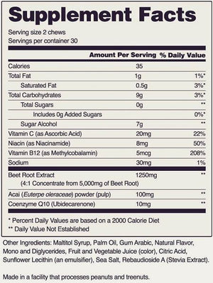 Supplement Facts Serving Size: 2 Soft Chews, Servings per Container: 30, Calories: 25, Total Fat: 0.25g, Sodium: 7mg, Total Carbohydrates: 5g, Sugars: 2g, Vitamin B3: 15mg, Vitamin B12: 2.4mcg, Vitamin C: 30mg, Beetroot Extract: 1250mg
