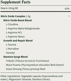 Supplement Facts Niacin 50mg NE, Nitric Oxide Complex 3.5g, L-Citrulline, L-Arginine Alpha Ketoglutarate, L-Arginine HCL, Growth and Repair Blend, L-Taurine, L-Norvaline, Stamina Surge Blend