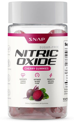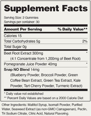 Supplement Facts Serving Size: 2 Gummies, Servings per container: 30, Amount Per Serving: Calories 15, Total Carbohydrates 5g, Total Sugar 0g, Beet Root Extract 300mg (1:1 Concentrate from 1200mg of Beetroot), Pomegranate Juice Powder 40mg, Snap NO Blend 14mg (Blueberry Powder, Broccoli Powder, Green Coffee Bean Extract, Green Tea Extract, Turmeric Extract, Kale Powder, Tart Cherry Powder)