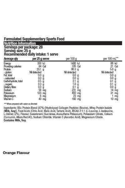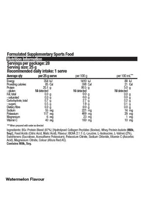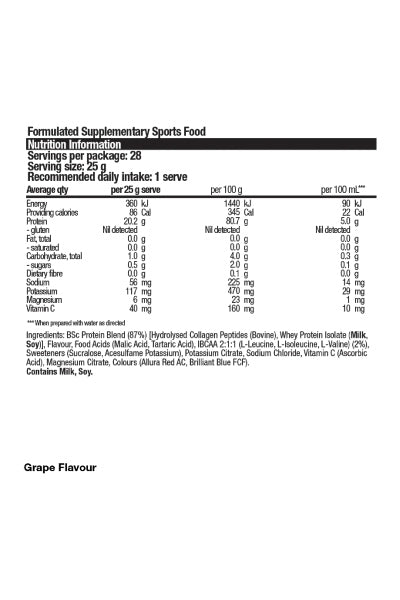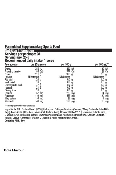 With 20g of protein per serve, you'll be supporting muscle recovery and growth. The unique blend features Hydrolysed Collagen Peptides, Whey Protein Isolate, and BCAAs, ensuring you're getting the most out of your workout. Plus, with added Vitamin C and essential sports minerals, you'll be boosting your overall health and wellbeing. Available in four mouth-watering flavours - Cola, Grape, Orange, and Watermelon - you'll be spoiled for choice.