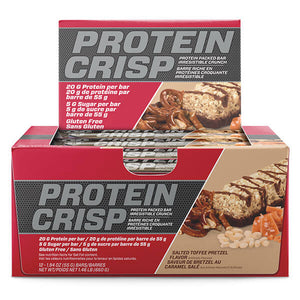 At 230-240 calories, each PROTEIN CRISP BAR is loaded with 20g of premium proteins and 2-4g of sugar. And with a light, crispy texture, every day will feel like a cheat day. Avaliable in 7 flavors. Chocolate Crunch, Vanilla Marshmallow, Peanut Butter Crunch, Salted Toffee Pretzel, Smores, Coldstone Birthday Cakre Remix and Coldstone Mint MInt Chocolate Chip.