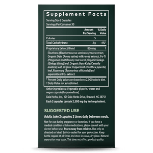 Eleuthero (Eleutherococcus senticosus) root extract, Organic Oats (Avena sativa) milky seed extract, Fo-Ti (Polygonum multiflorum) root cured, Organic Ginkgo (Ginkgo biloba) leaf, Organic Gotu Kola (Centella asiatica) leaf, Organic Peppermint (Mentha x piperita) leaf, Rosemary (Rosmarinus Officinalis) leaf supercritical CO2 extract