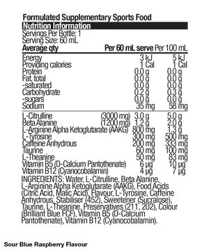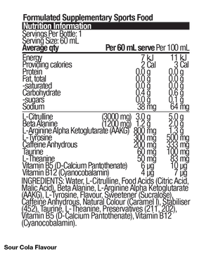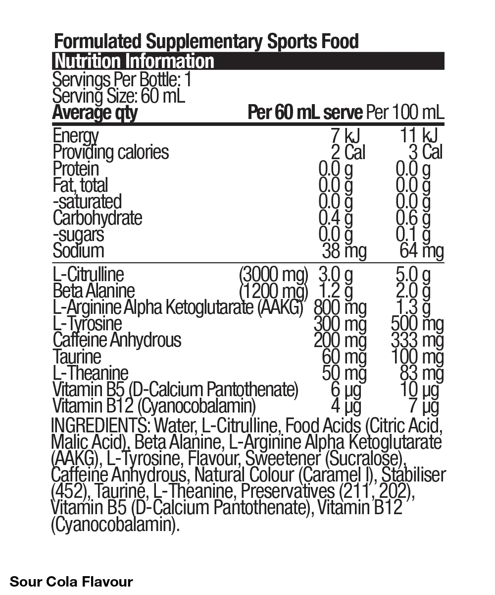 Each shot is packed with a powerful blend of key ingredients: 200mg caffeine for instant energy and focus, 3000mg L-Citrulline for blood flow and muscle pump support, 1200mg Beta-Alanine to buffer fatigue, 800mg L-Arginine to enhance performance and circulation, and 300mg L-Tyrosine for mental focus and mood support.