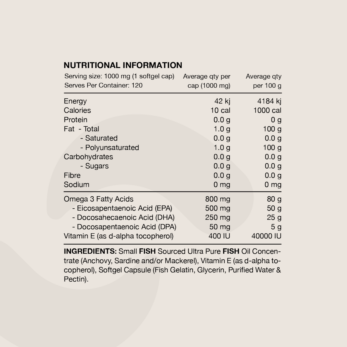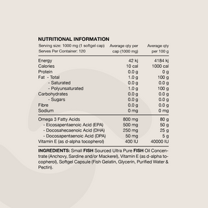 Switch Nutrition’s Ultra Fish Oil is crafted from sustainably sourced Norwegian small fish like sardines, anchovies, and mackerel. Each softgel delivers a potent dose with 500mg DHA, 250mg EPA, and 50mg DPA, supporting heart health, brain function, joints, skin, and mood. Enhanced with 400 IU natural Vitamin E, this formula provides antioxidant protection and purity through molecular distillation. Rigorously tested for contaminants, it ensures safety and effectiveness. Suitable for daily supplementation, it comes in 30 and 120 serve options. The optimal 2:1 DHA to EPA ratio supports overall wellness elegantly. Lightweight and easy to swallow softgels make it convenient to incorporate into your routine. The small batch production guarantees high quality and freshness. This supplement offers a simple, effective way to boost omega-3 intake for vital health benefits.